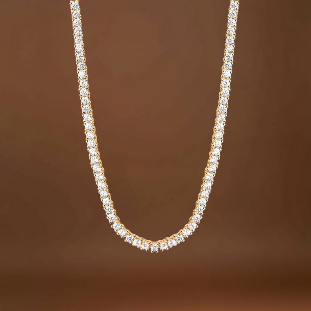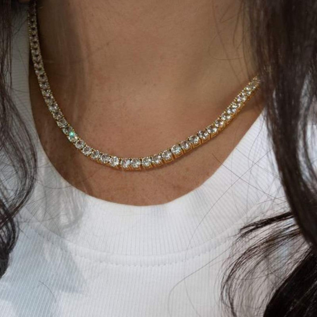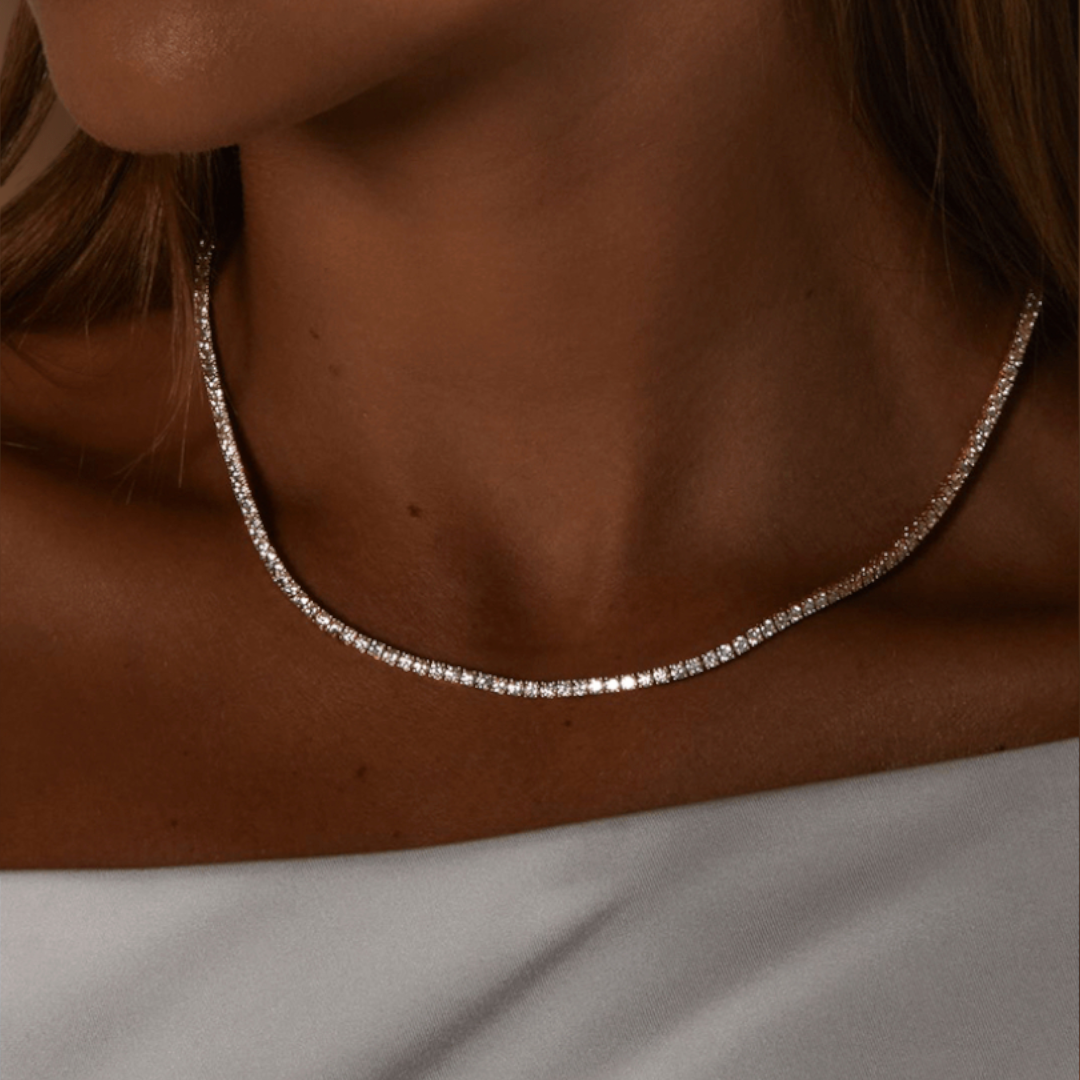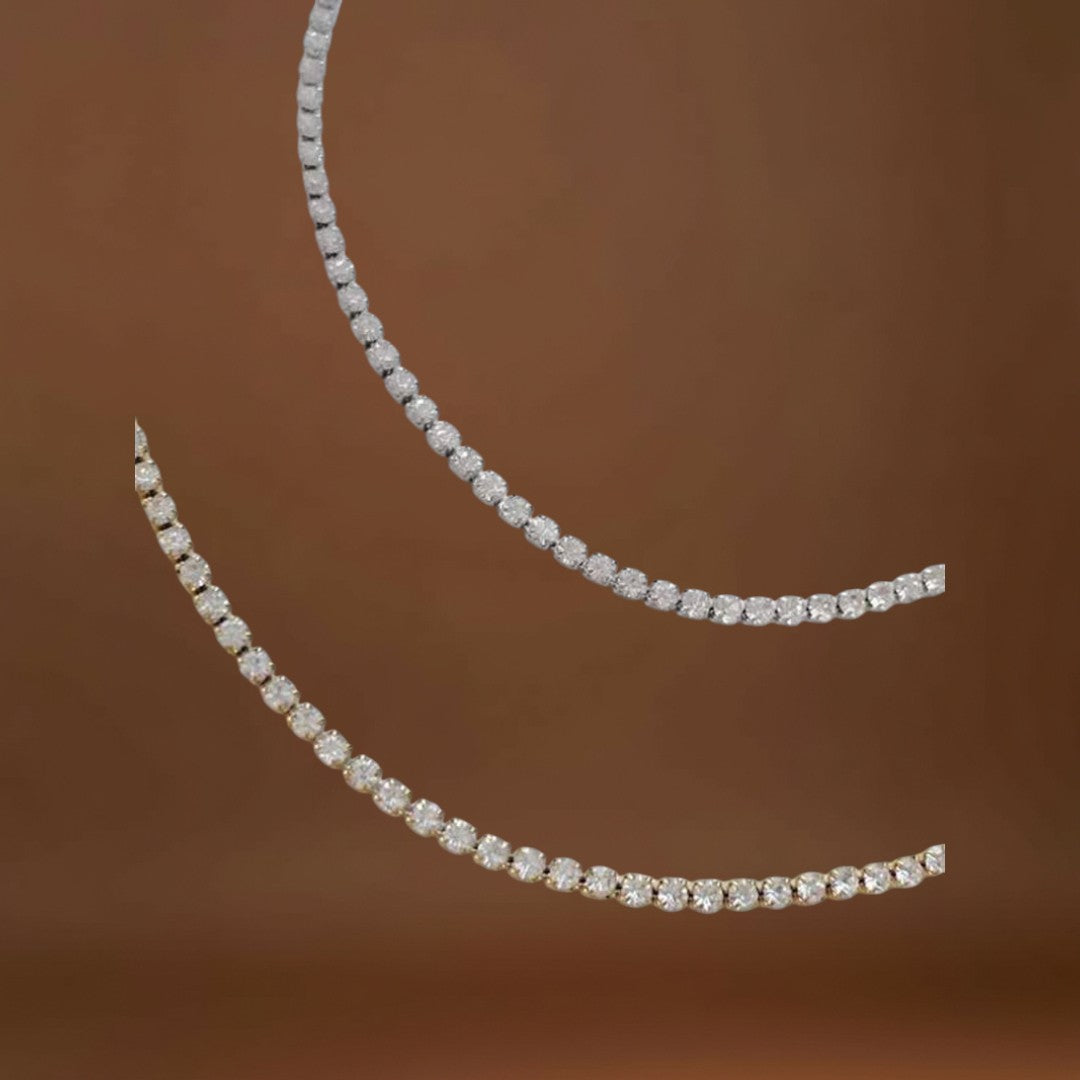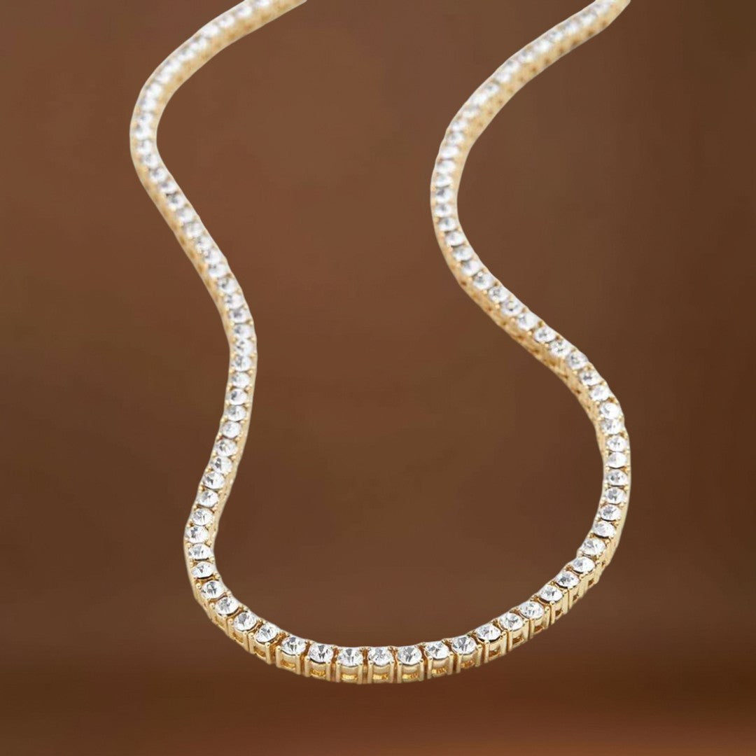 Adj egy csipetnyi luxust a Riviéra Nyaklánccal, 14 karátos arany bevonattal. Ez a kifinomult darab egy folyamatos vonalat mutat be csillogó kövekből, lenyűgöző és elegáns hatást keltve. Tökéletes bármilyen alkalomra, klasszikus és fényűző érintést adva, hogy felemelje a stílusodat.
