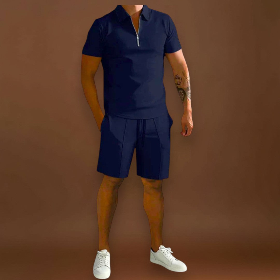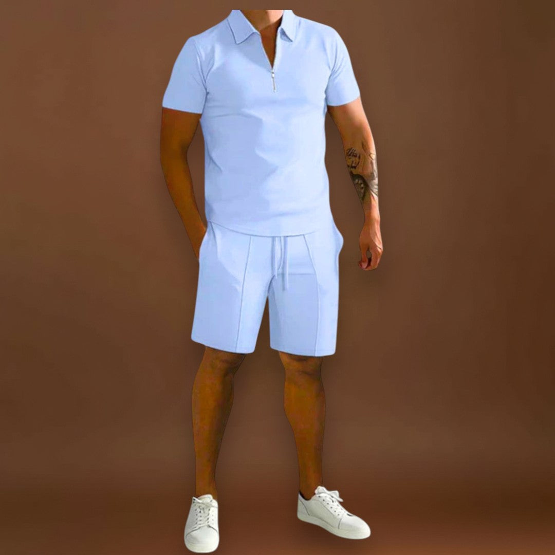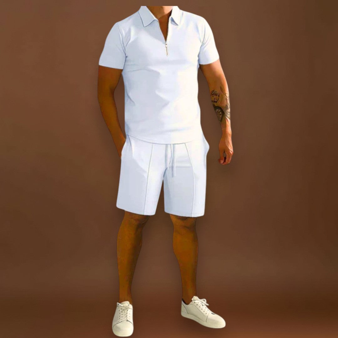A Carlos szett pólót és sortot kombinál egy kifinomult, de laza stílusban, ideális a melegebb napokra. Sokoldalú és modern, könnyen alkalmazkodik különböző alkalmakhoz, a laza találkozóktól kezdve a nyári elegáns pillanatokig.