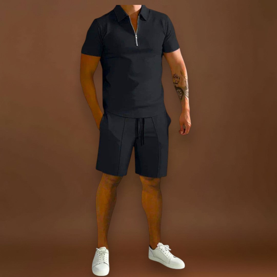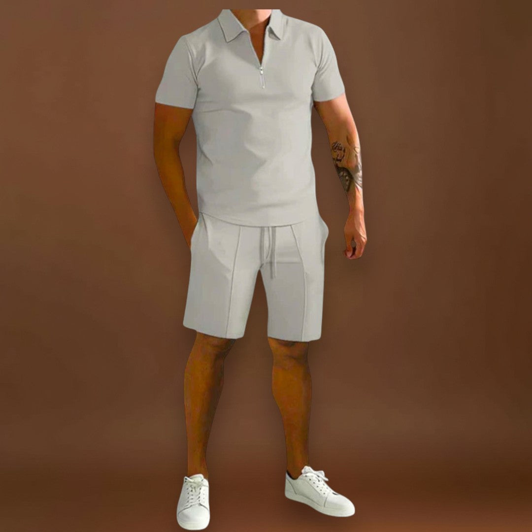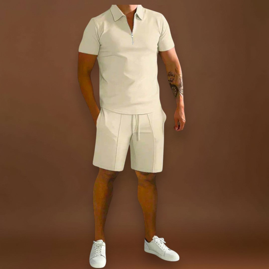 A Carlos szett pólót és sortot kombinál egy kifinomult, de laza stílusban, ideális a melegebb napokra. Sokoldalú és modern, könnyen alkalmazkodik különböző alkalmakhoz, a laza találkozóktól kezdve a nyári elegáns pillanatokig.