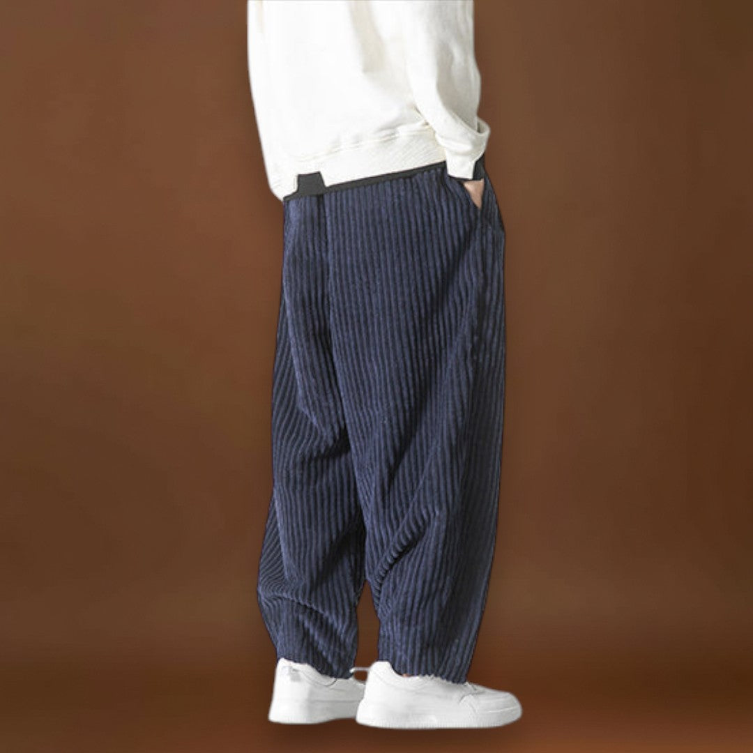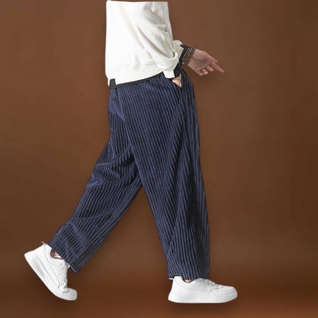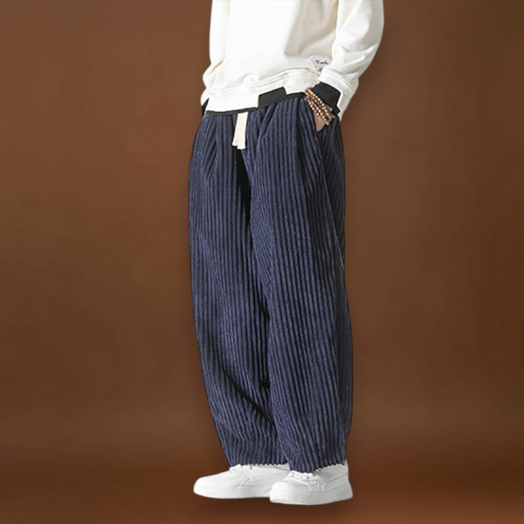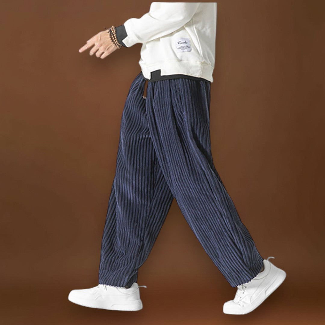 A kifinomult kényelem ötvöződik az időtlen stílussal - a Masaaki™ csíkos bársonynadrág!