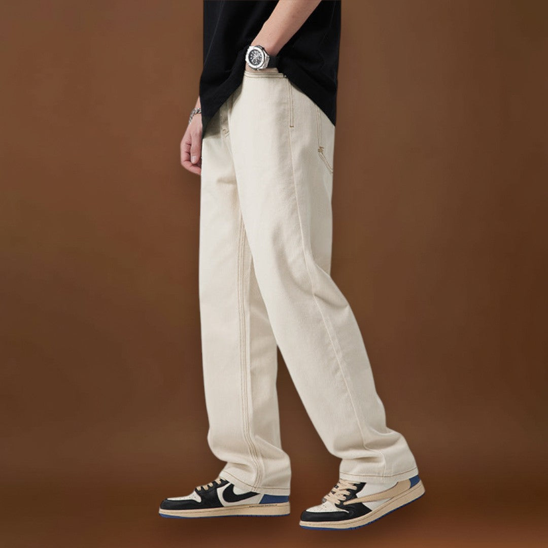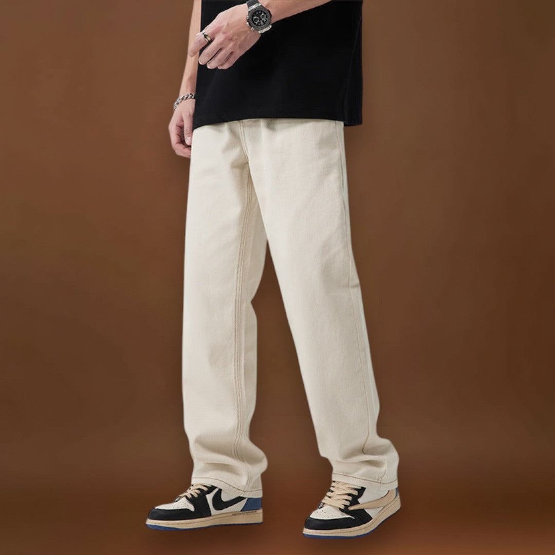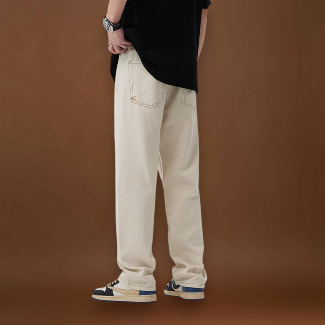 Ez a szett egy krémszínű, egyenes szárú nadrágot kombinál egy fekete oversized pólóval. A nadrág egyenes szabású, amely a combtól a szegélyig megőrzi a láb formáját. A póló oversized fazonú, amely extra helyet biztosít a testen és az ujjakon.