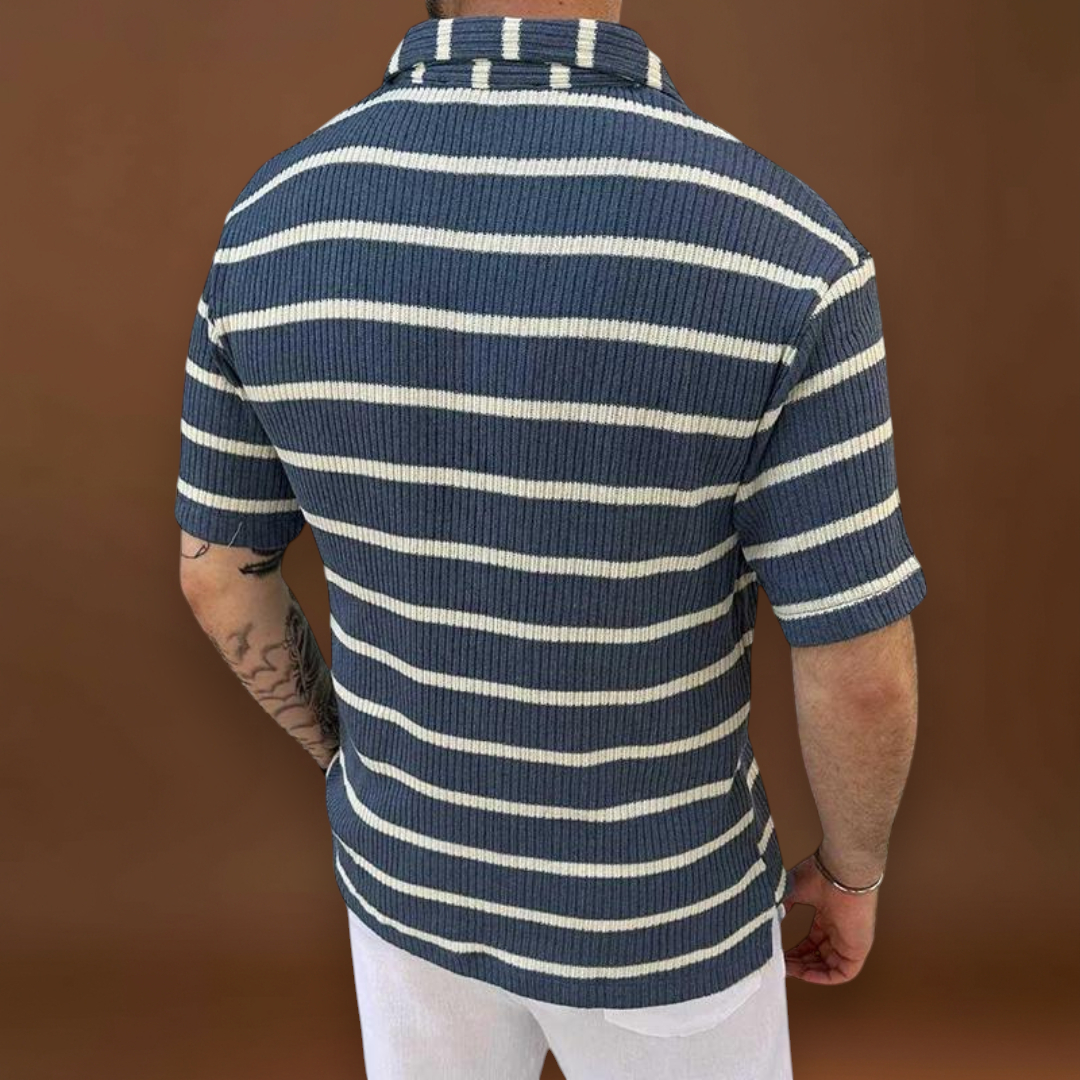 Ez a csíkos poloing egy puha anyagkeveréket használ, amely lehetővé teszi a levegő áramlását a kényelem érdekében. A Johnny gallér simán fekszik, és a gomb nélküli pánt megkönnyíti a fel- és levételt. A klasszikus varrási pontok tartósságot adnak, és segítenek a pólónak megőrizni a formáját mosás után.