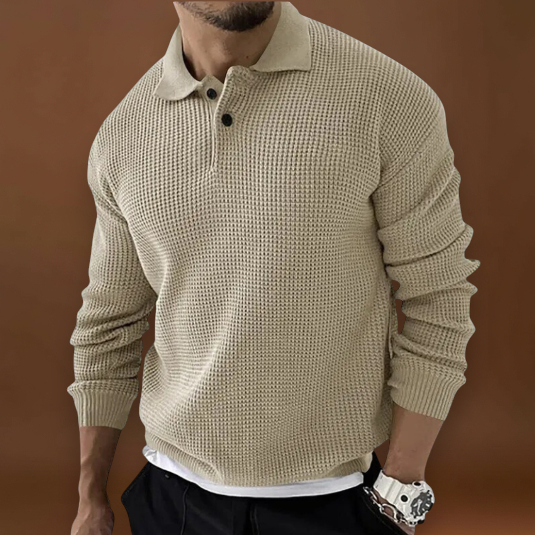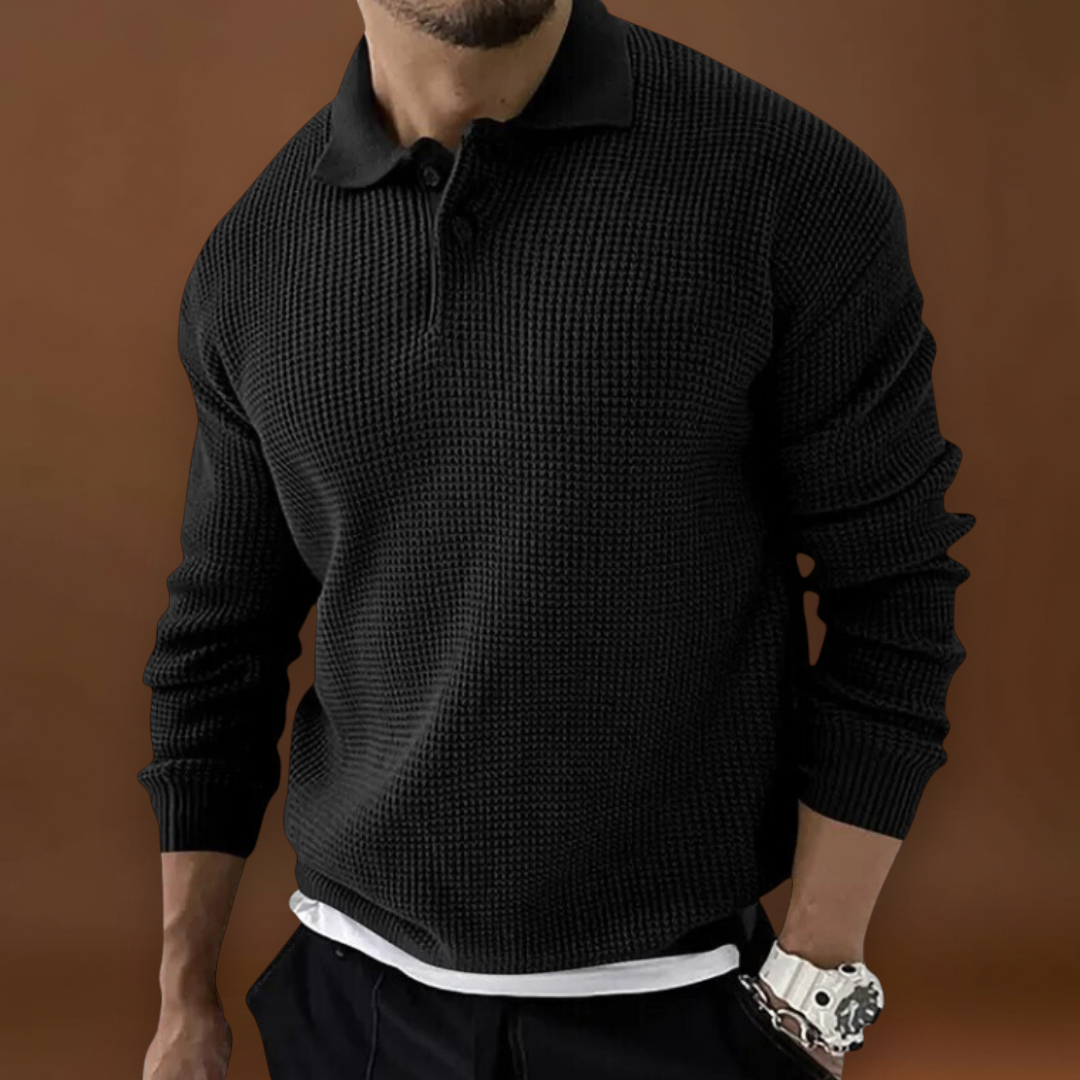 Ez a texturált waffle kötött polo pulóver egy klasszikus polo gallérral kombinálja a texturált kötésmintát. A waffle kötés mélységet ad a felületnek, miközben megtartja a szövet struktúráját. A polo stílusú gallér laposan fekszik, és nyitva vagy zárva viselhető, hogy megváltoztassa a fedést és a nyak formáját.