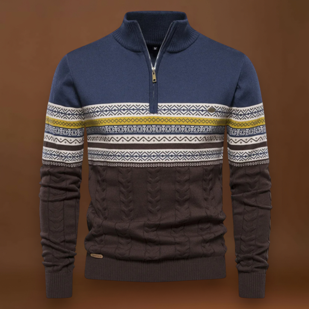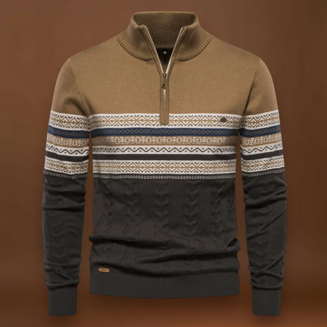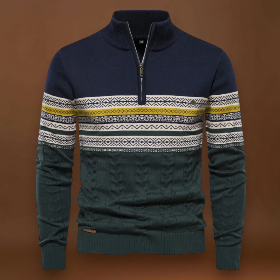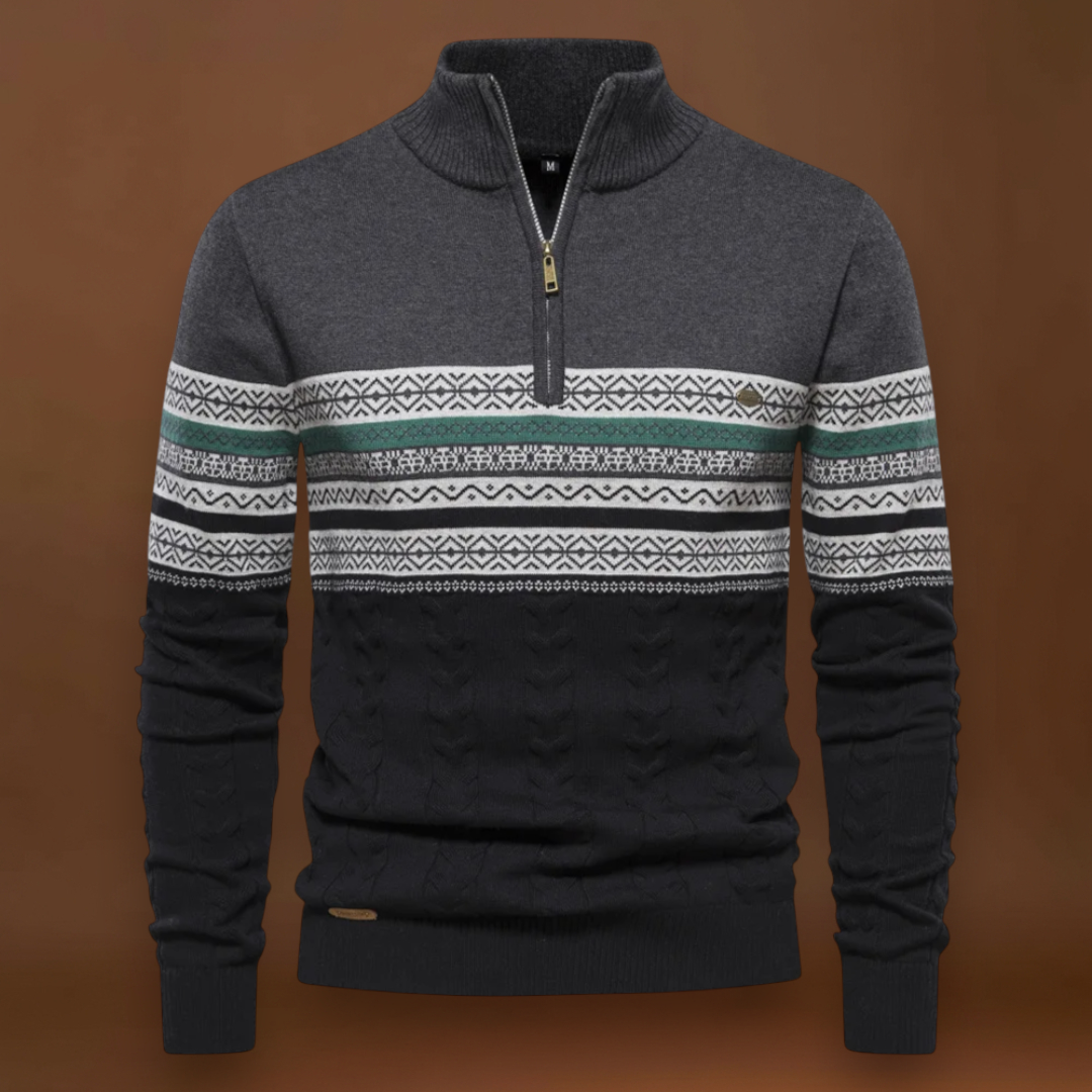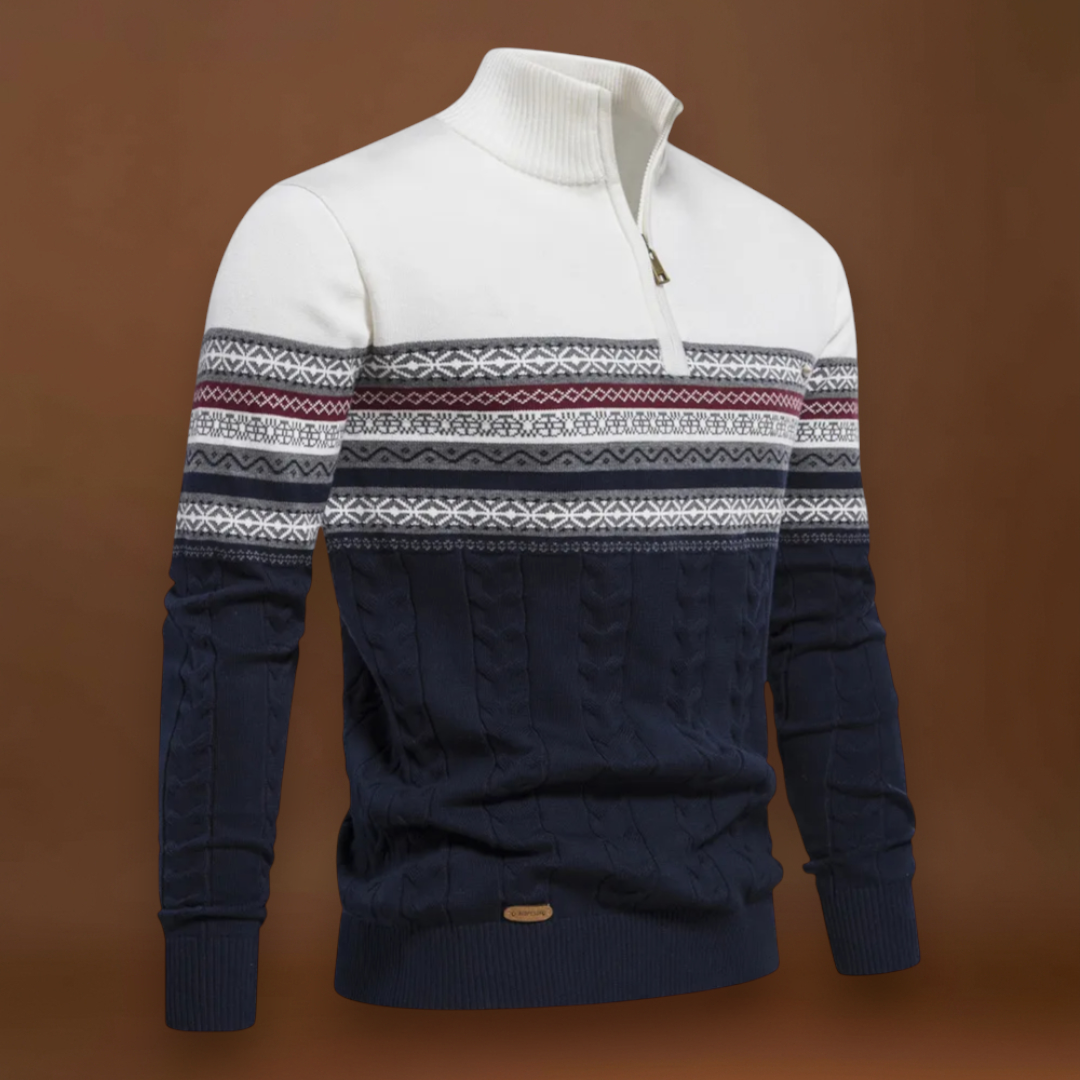 Az Alpenfrost pulóver kétszínű alpesi mintával rendelkezik, amely kábelmintás részletekkel gazdagítja a textúrát és a szerkezetet. A negyed cipzáras nyitás lehetővé teszi a szabályozható szellőzést és a gallér egyszerű formázását. A kötött anyag keveréke egyensúlyt teremt a kényelmes tapintás és a tartós használat között.