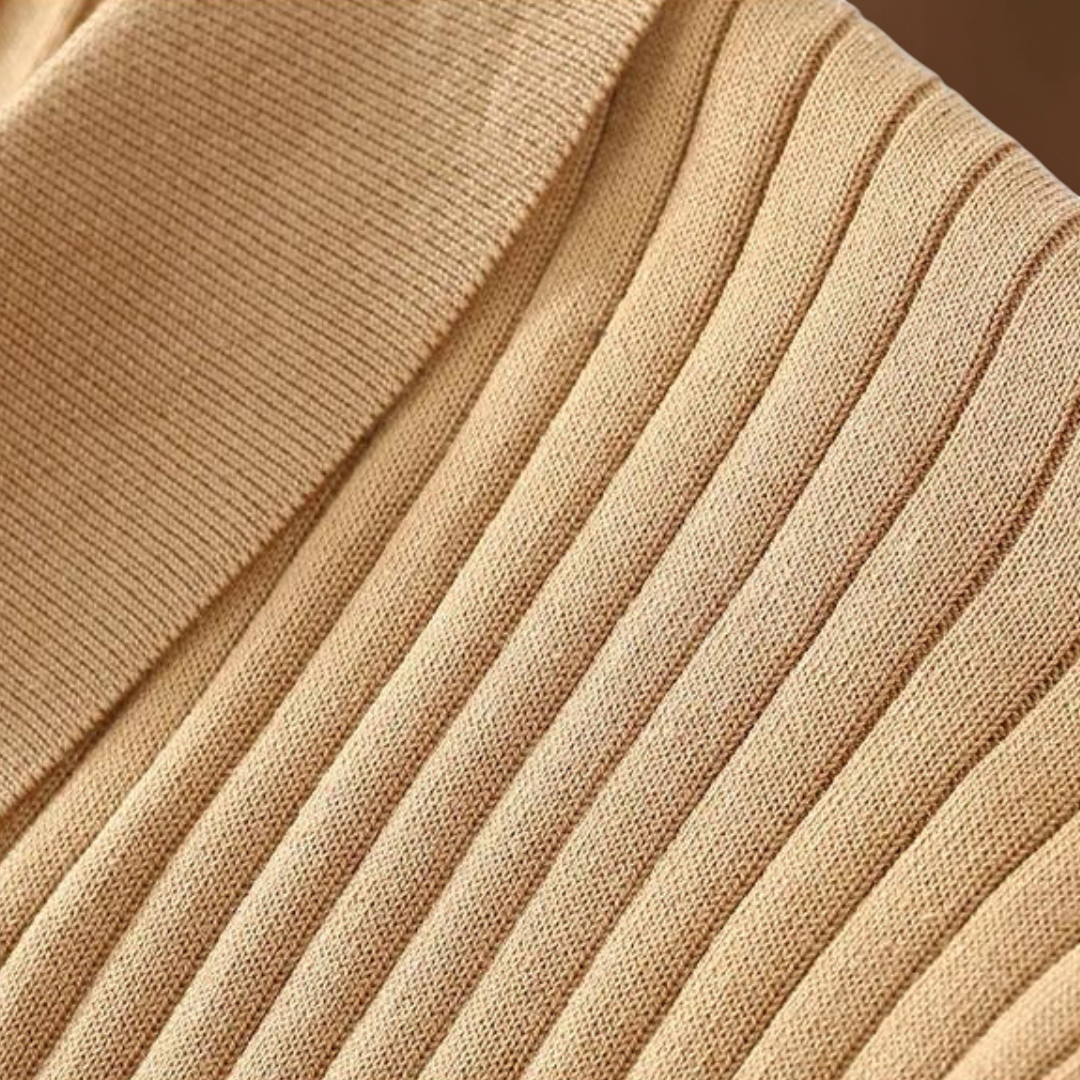 Ez a vintage ihletésű póló lyocell keverékből készült, amely légáteresztő és puha szálakat kombinál a lágy és kényelmes befejezés érdekében. A kötött anyag ráncolt varrással rendelkezik az elülső gallérnál, a mandzsettákon és az alján, hogy megőrizze a formáját és jól definiált sziluettet biztosítson. A pólón klasszikus gallér és rövid gombos gallér található, amely megkönnyíti a felvételt.
