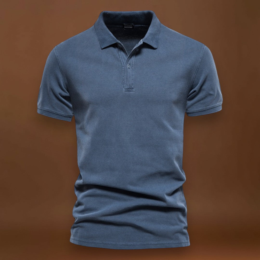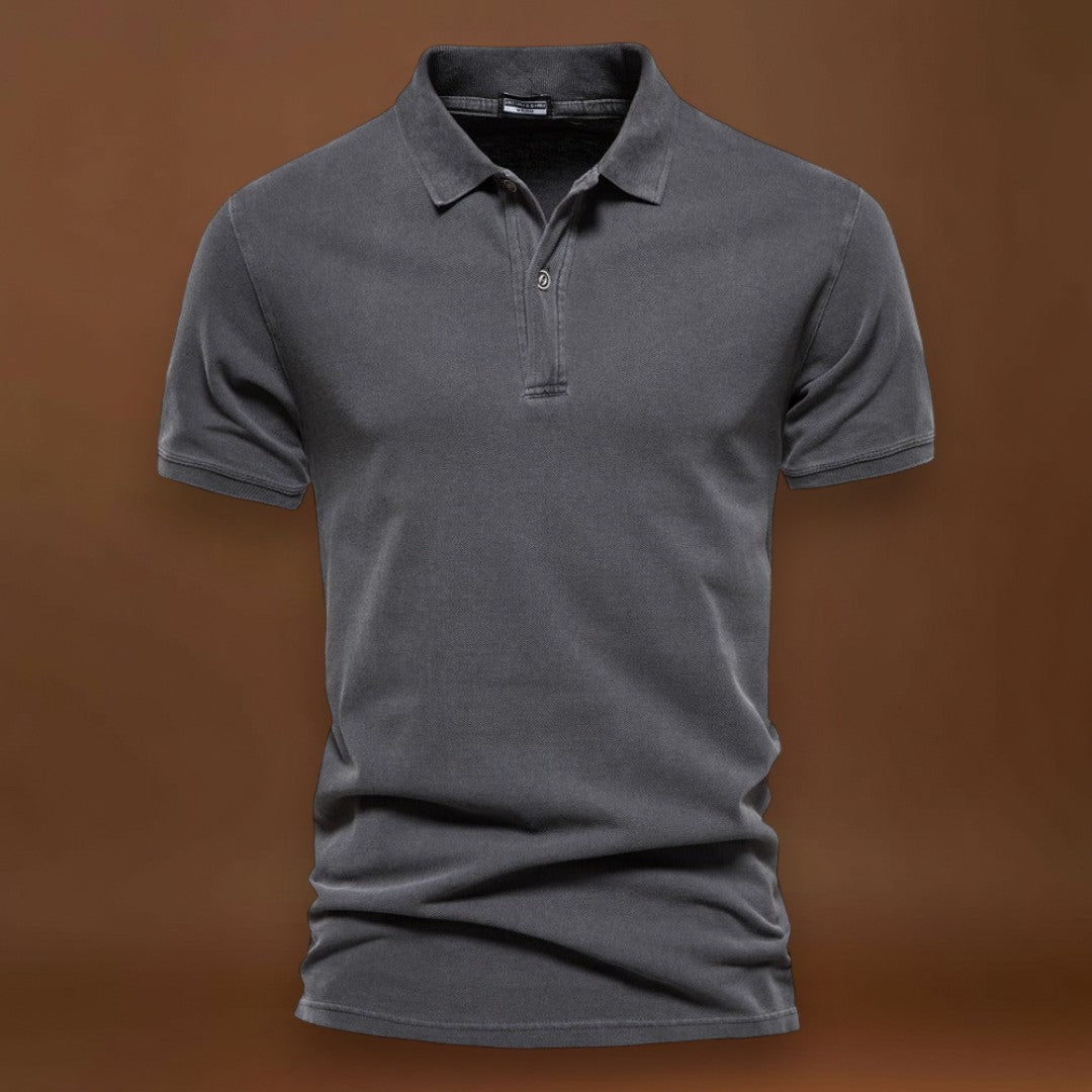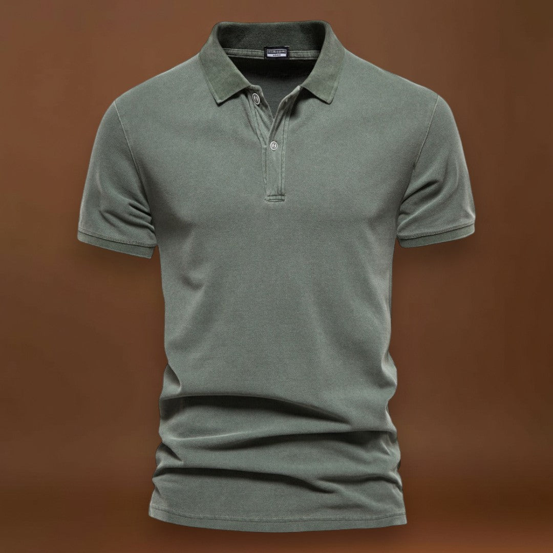 Ez a poloing klasszikus, laza szabású, amely megőrzi a rendezett formát. Az anyag puha, természetes szálak keveréke, amely lélegzik és kényelmes a bőrön. A három gombos záródás és a bordás gallér tiszta dekoltázst biztosít. A rövid ujjú kialakítás könnyű karmozgást tesz lehetővé. A varrások megerősítettek a feszültségi pontoknál, hogy a darab hosszú távon megőrizze formáját.