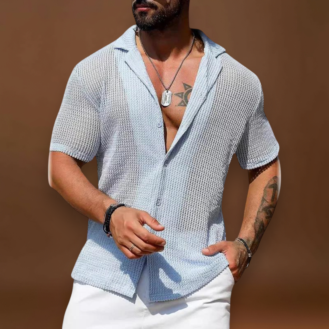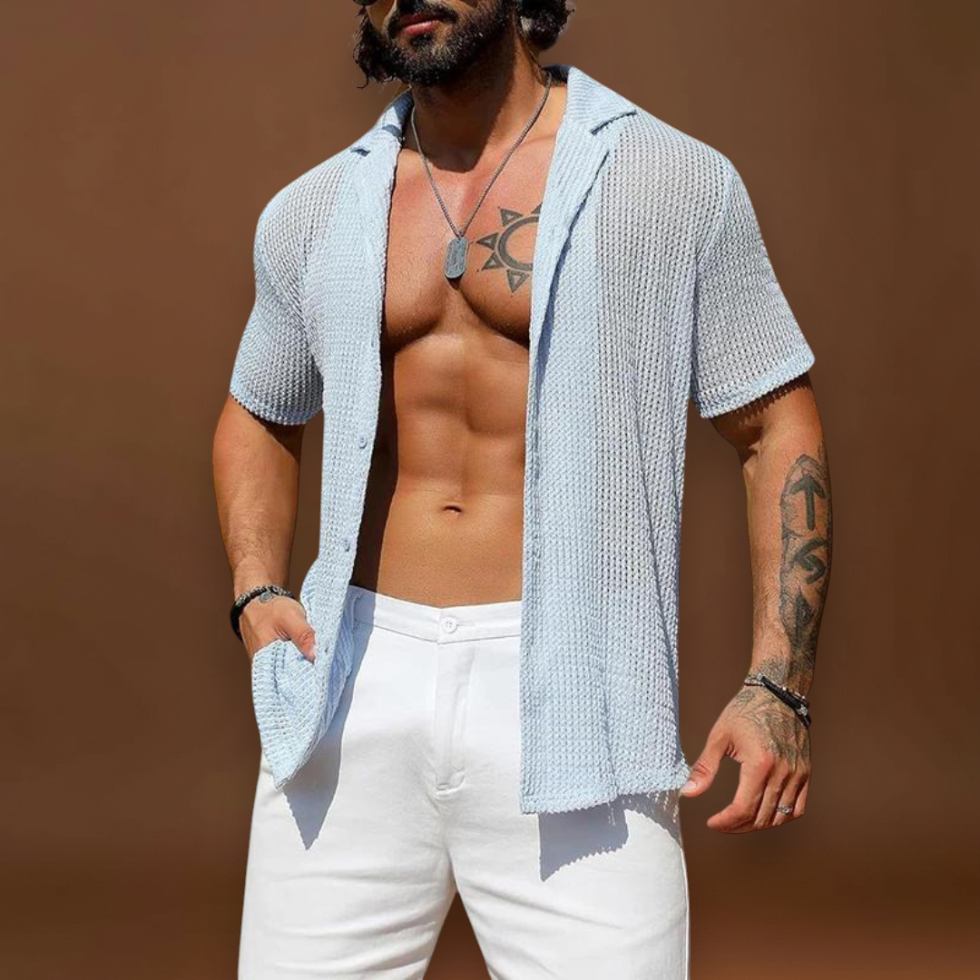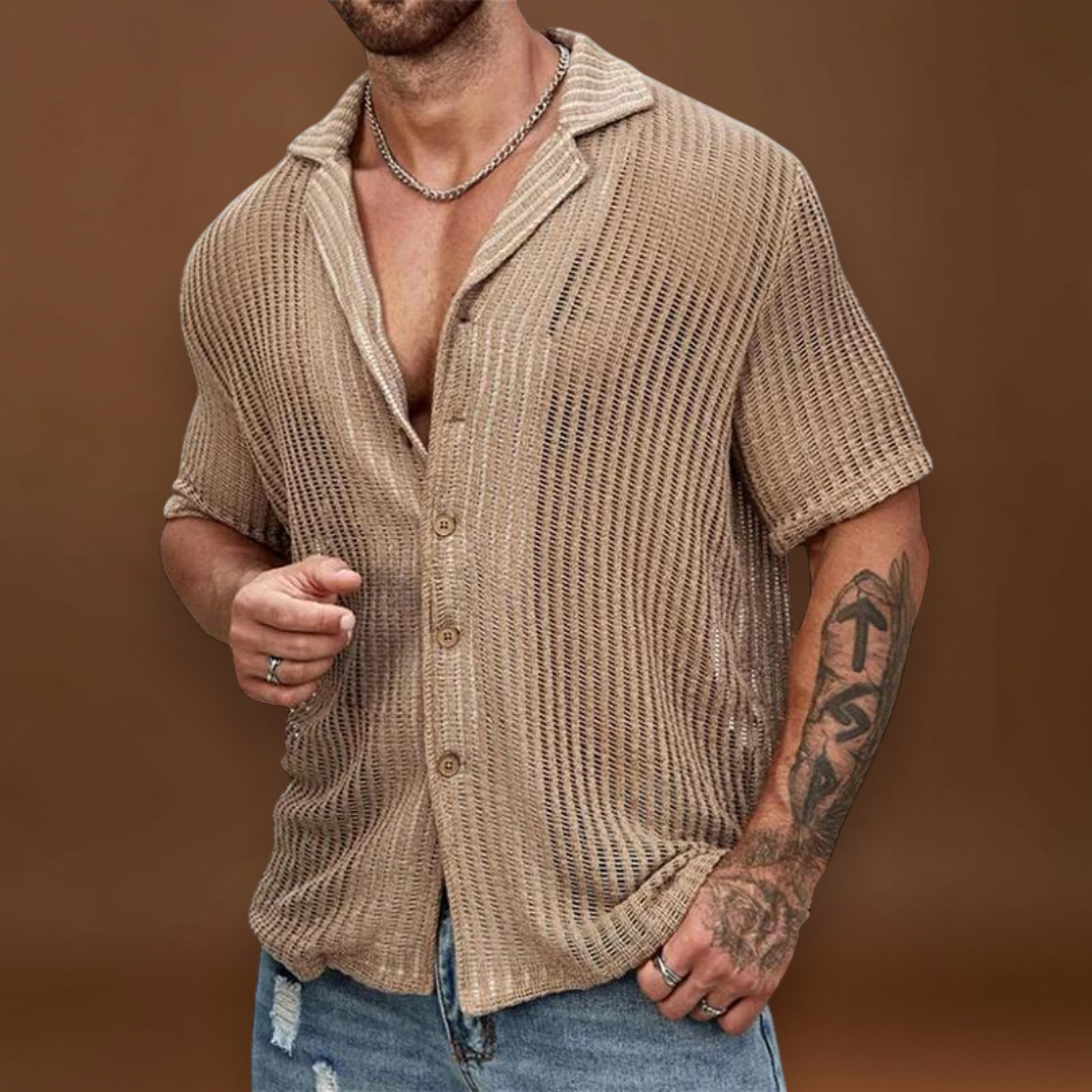 A szövet egy könnyű keverék, amely enyhén rugalmas. A rugalmasság segít az ingnek a test mozgásával együtt mozogni, és megőrzi az alakját használat után. A mesh szerkezet gyorsabban szárad, mint a szoros szövetek. Ezért az ing gyorsan szárad a mosás vagy enyhe izzadás után.