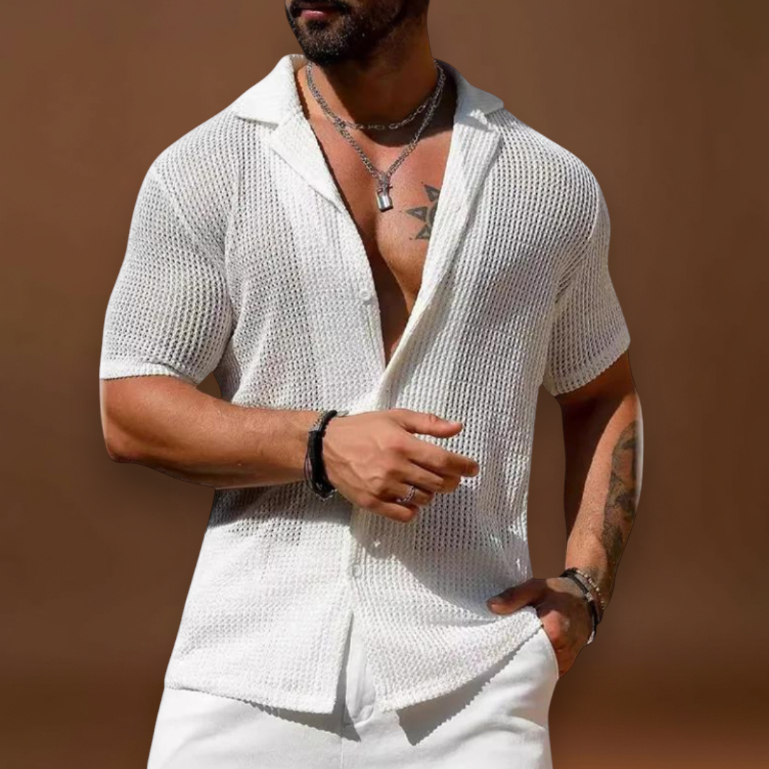 A rövidujjú ing laza mesh anyagból készült, amely lehetővé teszi a levegő áramlását. A mesh minta lehetővé teszi, hogy a levegő áthaladjon, segítve a testet a hűvös maradásban és csökkentve az izzadság felhalmozódását. A rövid ujjak mozgási szabadságot biztosítanak a karoknak, és szabadon hagyják a vállakat.
