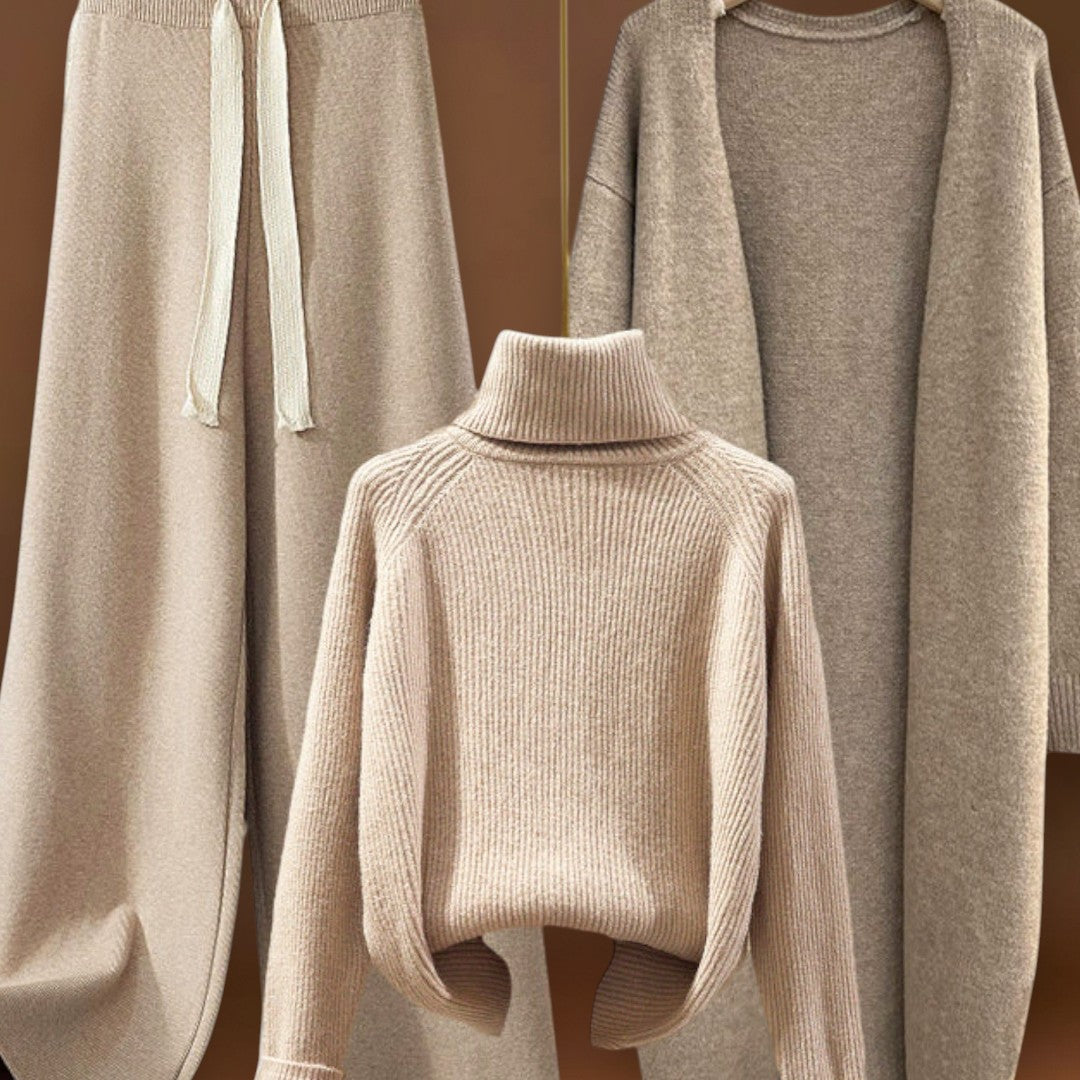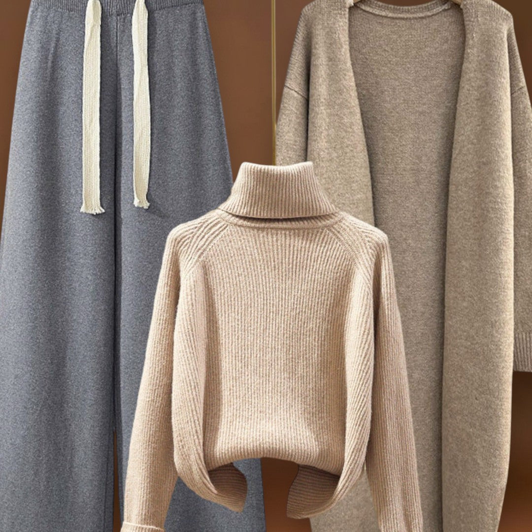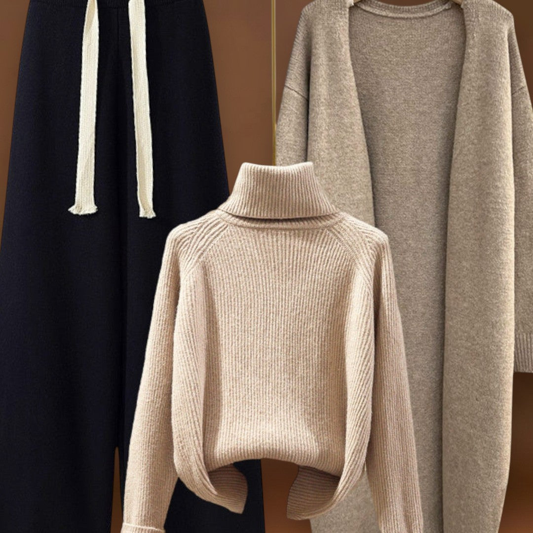 • Teljes 3 darabos szett – Tartalmaz egy magas nyakú pulóvert, egy hosszú kardigánt és egy magas derekú, széles szárú nadrágot a harmonikus megjelenésért.